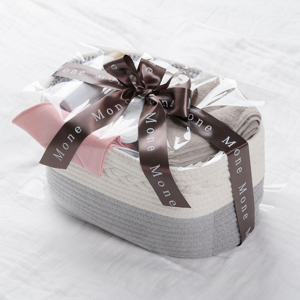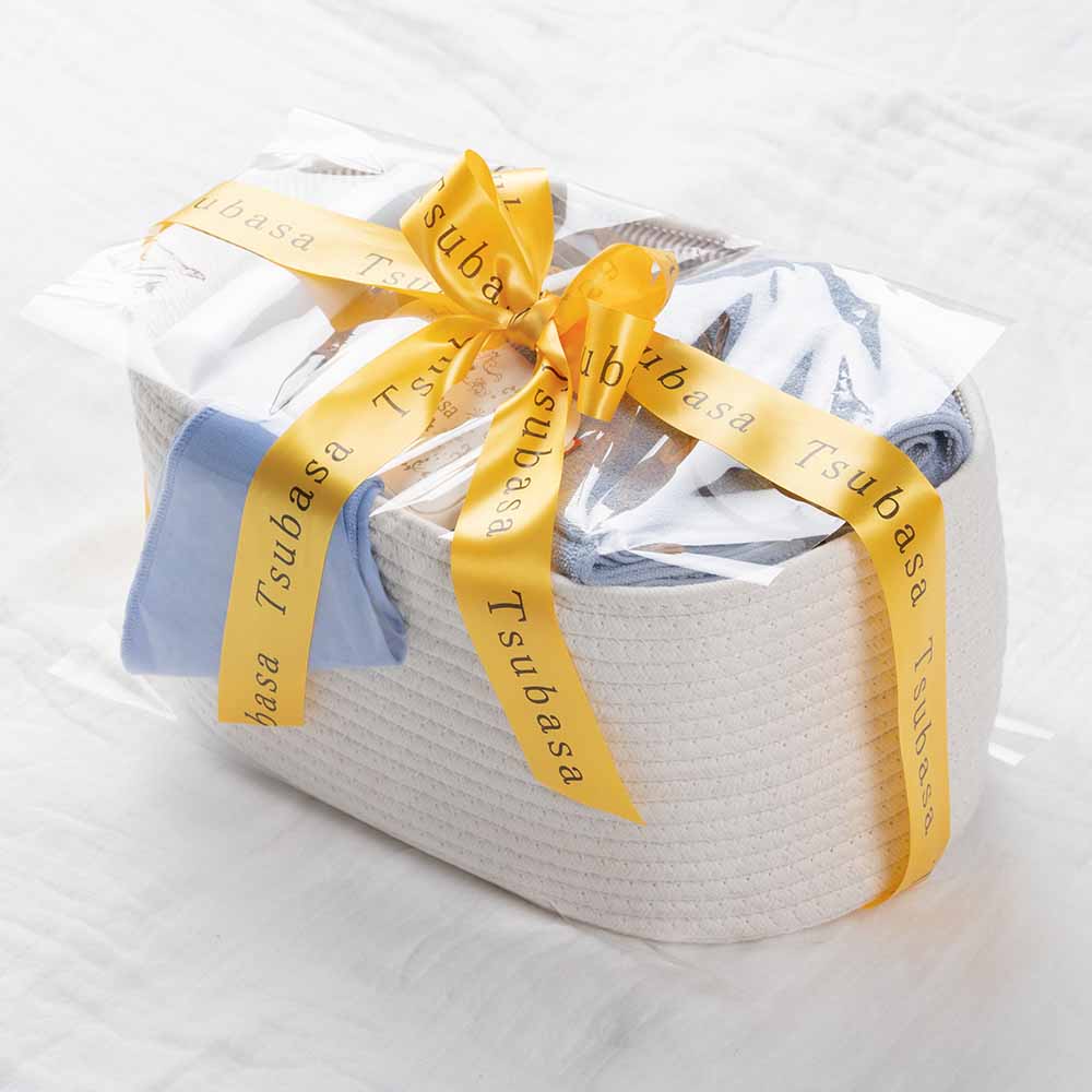 このおむつケーキは、特別なディテールも加えられています。4cm幅のリボンには、ベビーの名前が入れられています。また、おしりふきのフタにもベビーの名前を入れることができます。これにより、出産祝いの贈り物がさらに一層特別なものになります。