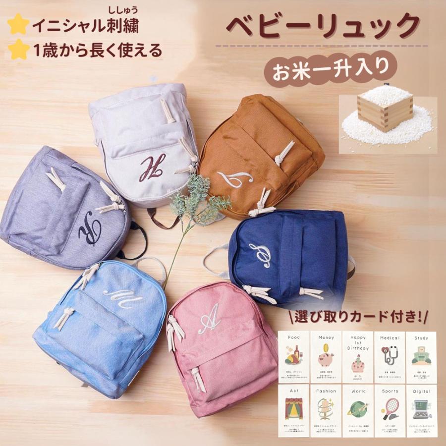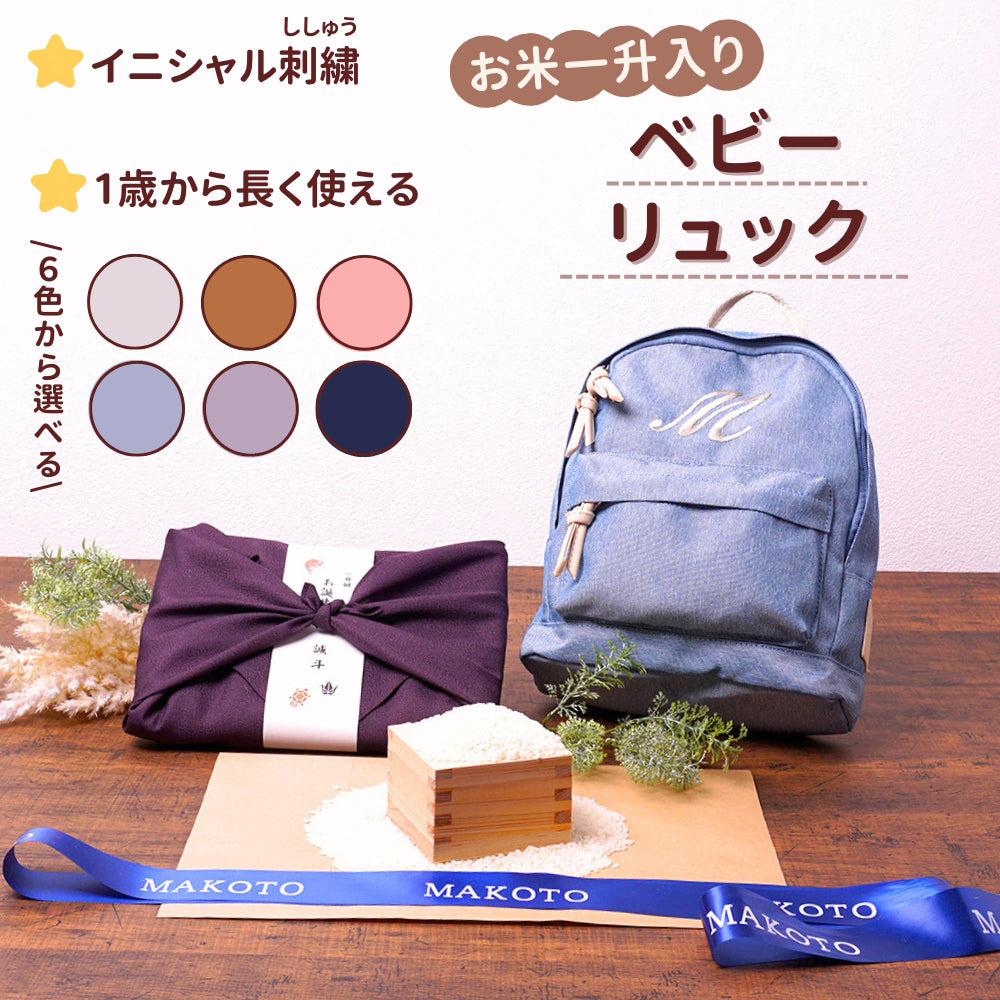 | 商品内容 | ベビーリュック×1個、お米風呂敷包み(1升)お米(うるち米:1.5kg) ※刺しゅうの色は、お選びいただけません。 おまけ:名入れ選び取りカード(10枚セット) |